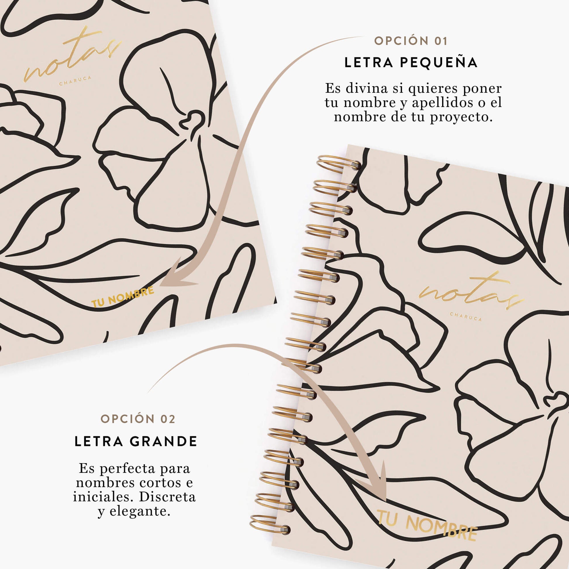 En Charuca tenemos un servicio de personalización artesanal. Escribe tu nombre o tus iniciales con letras doradas en la portada de tu papelería favorita. Puedes elegir entre dos tamaños de letra.