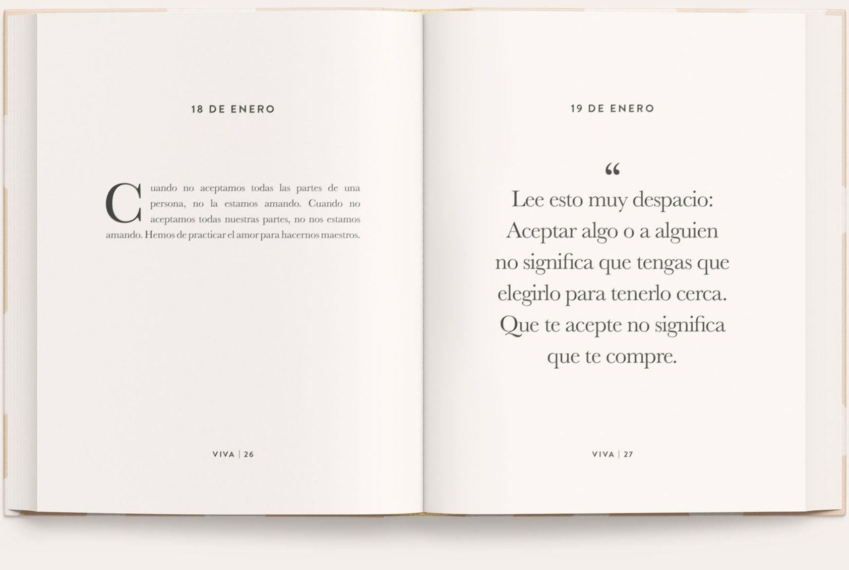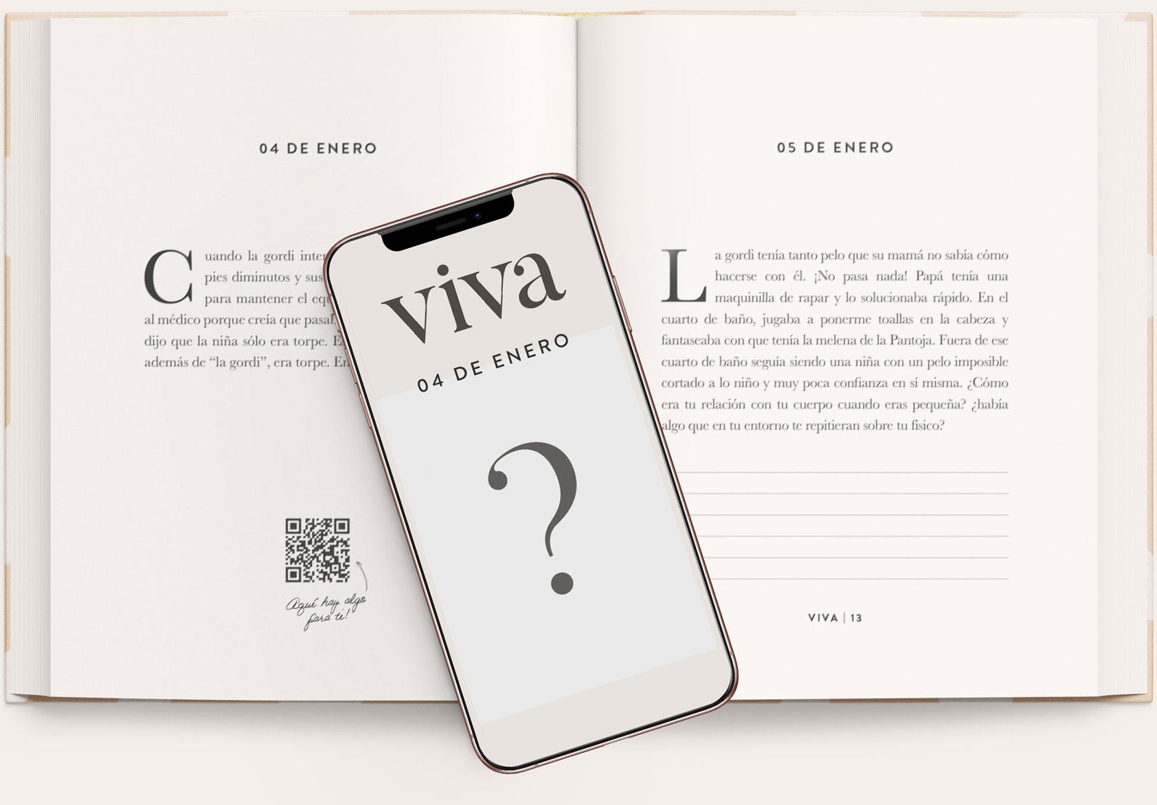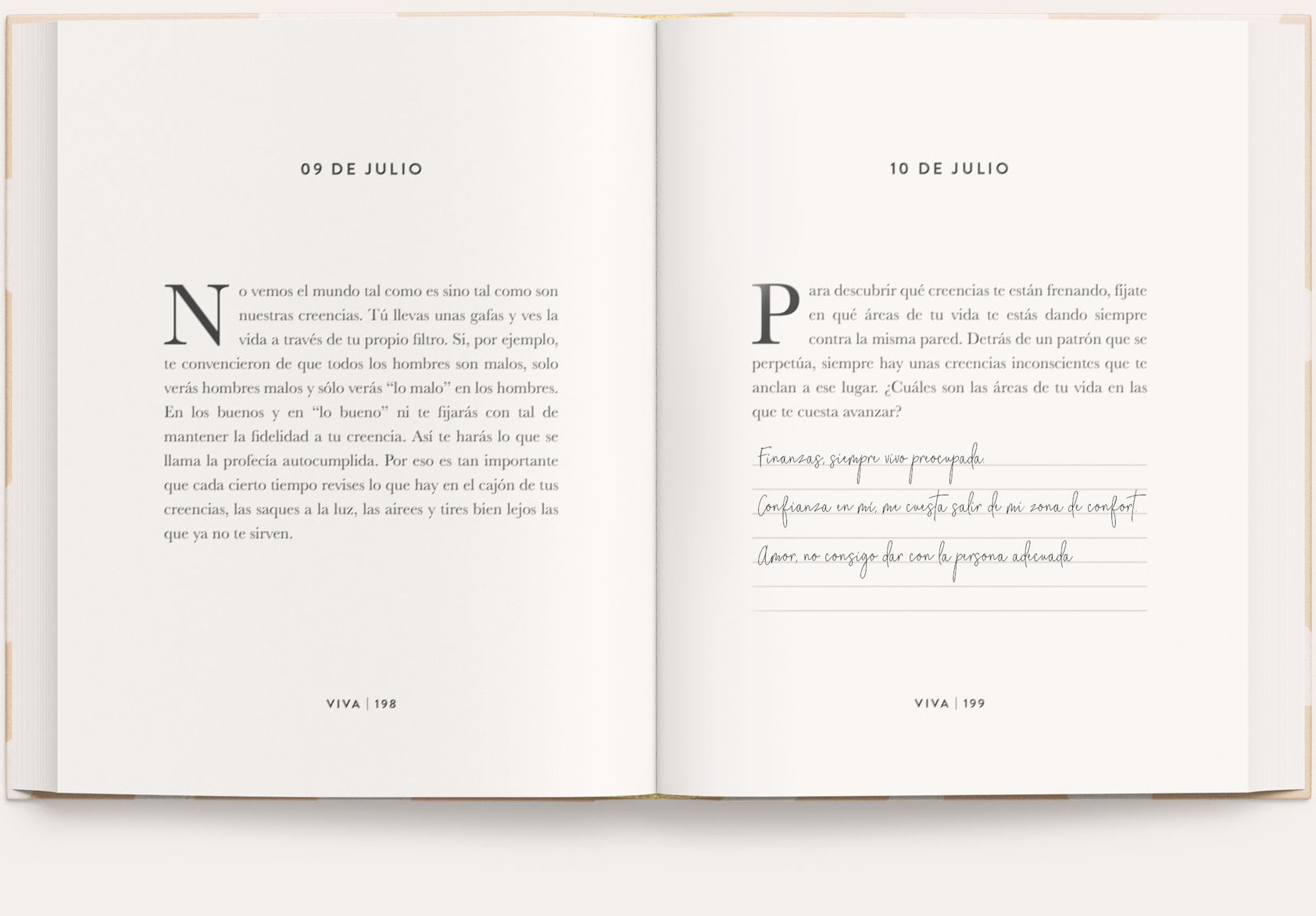 VIVA contiene un mensaje para cada día. La página del día a veces te invitará a reflexionar, otras a escribir, otras a tomar acción, otras a que descubras un regalo que he dejado para ti. VIVA es un oráculo, es tu diario, es esa amiga que te invita a reflexionar, a mirar las cosas con otras gafas, a moverte, a agitar un poquito el tablero de este juego que es tu Vida.