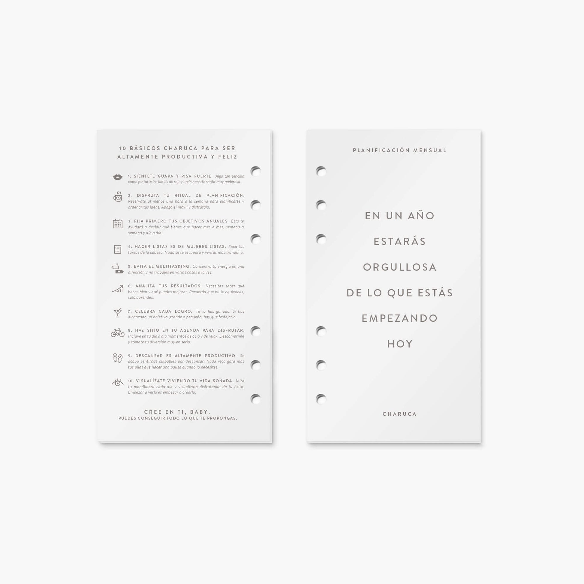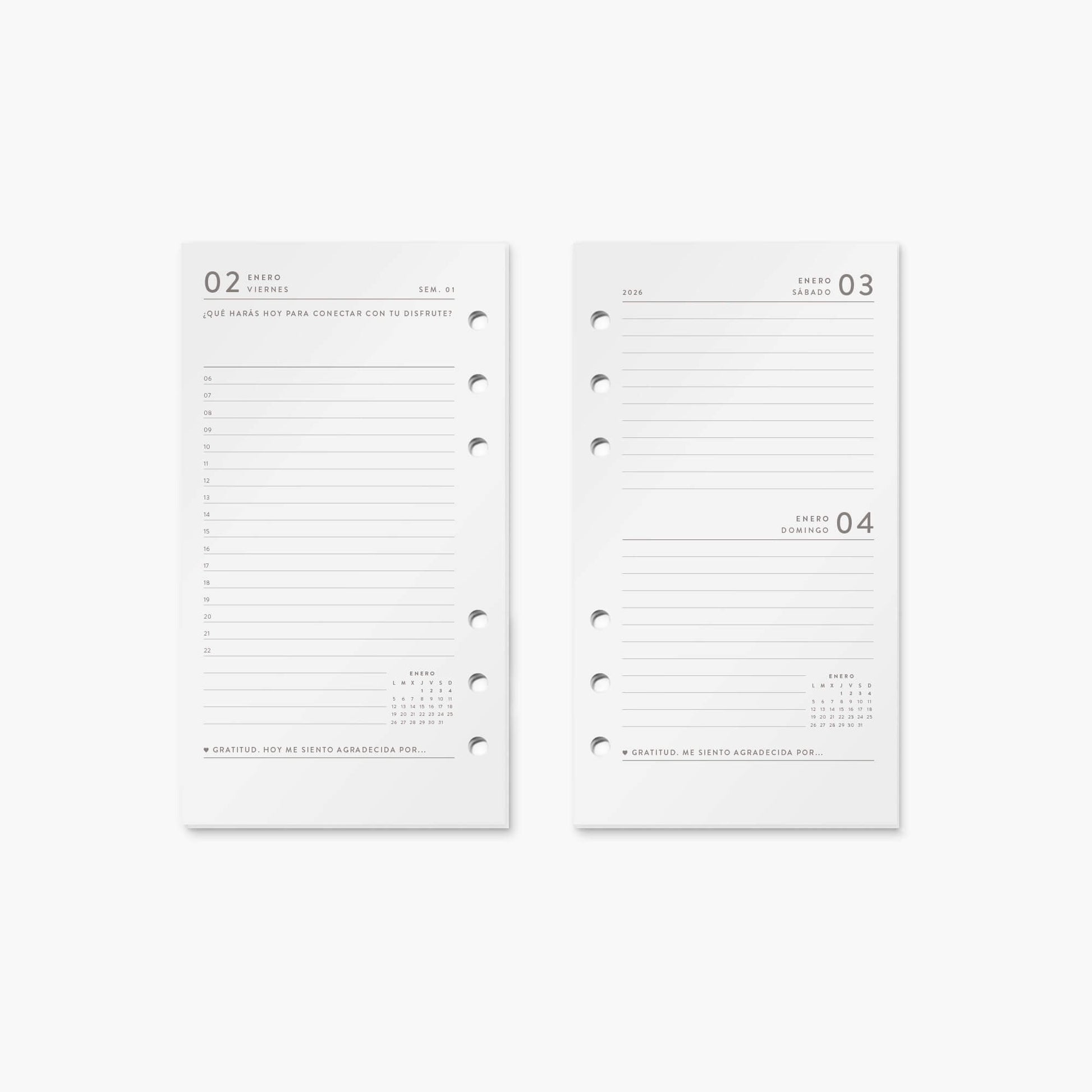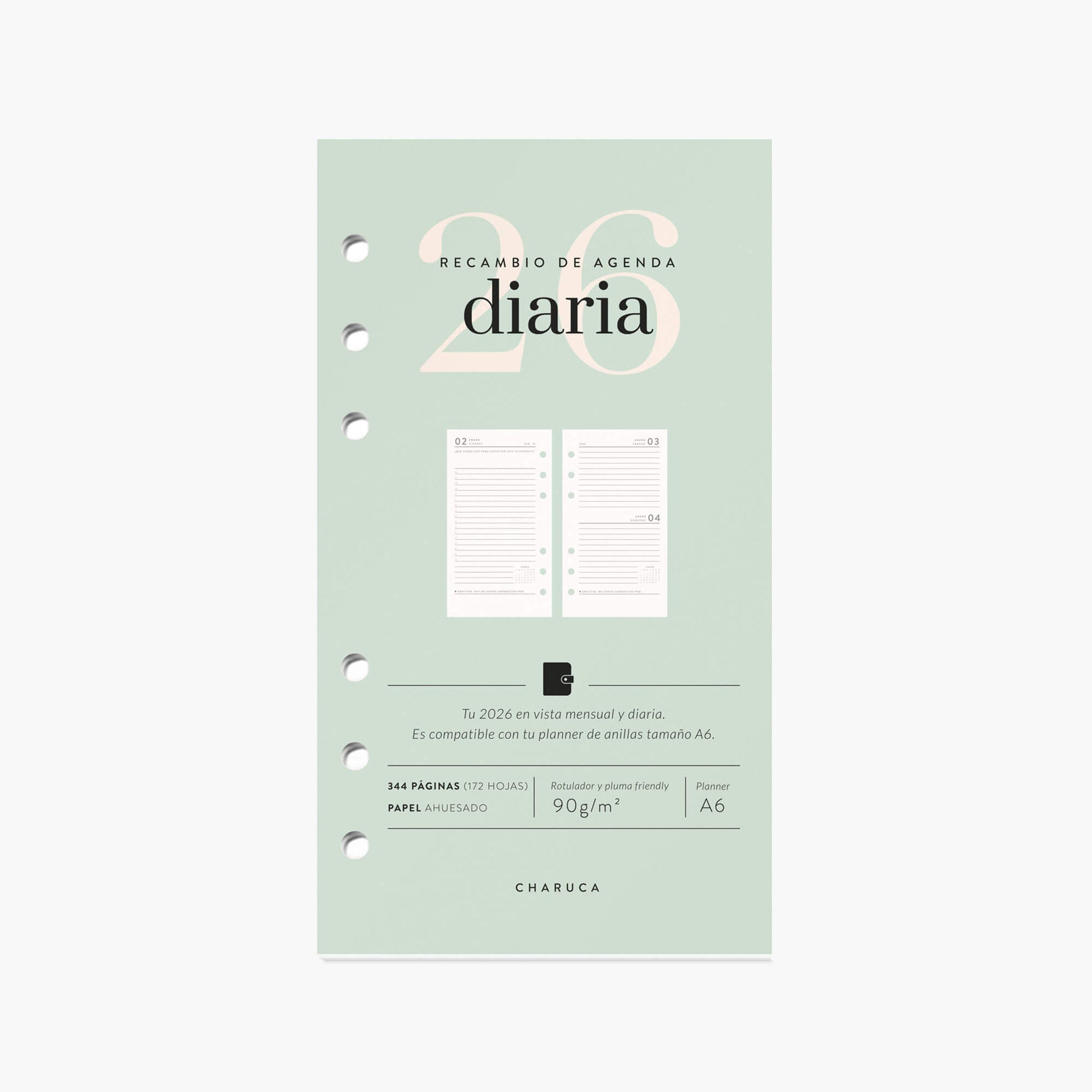 Tu recambio de agenda 2026 en vista diaria. Este recambio es compatible con tu agenda de anillas (planner) tamaño A6. También contiene planificadores mensuales Hecho en España con amor y sin prisas.
