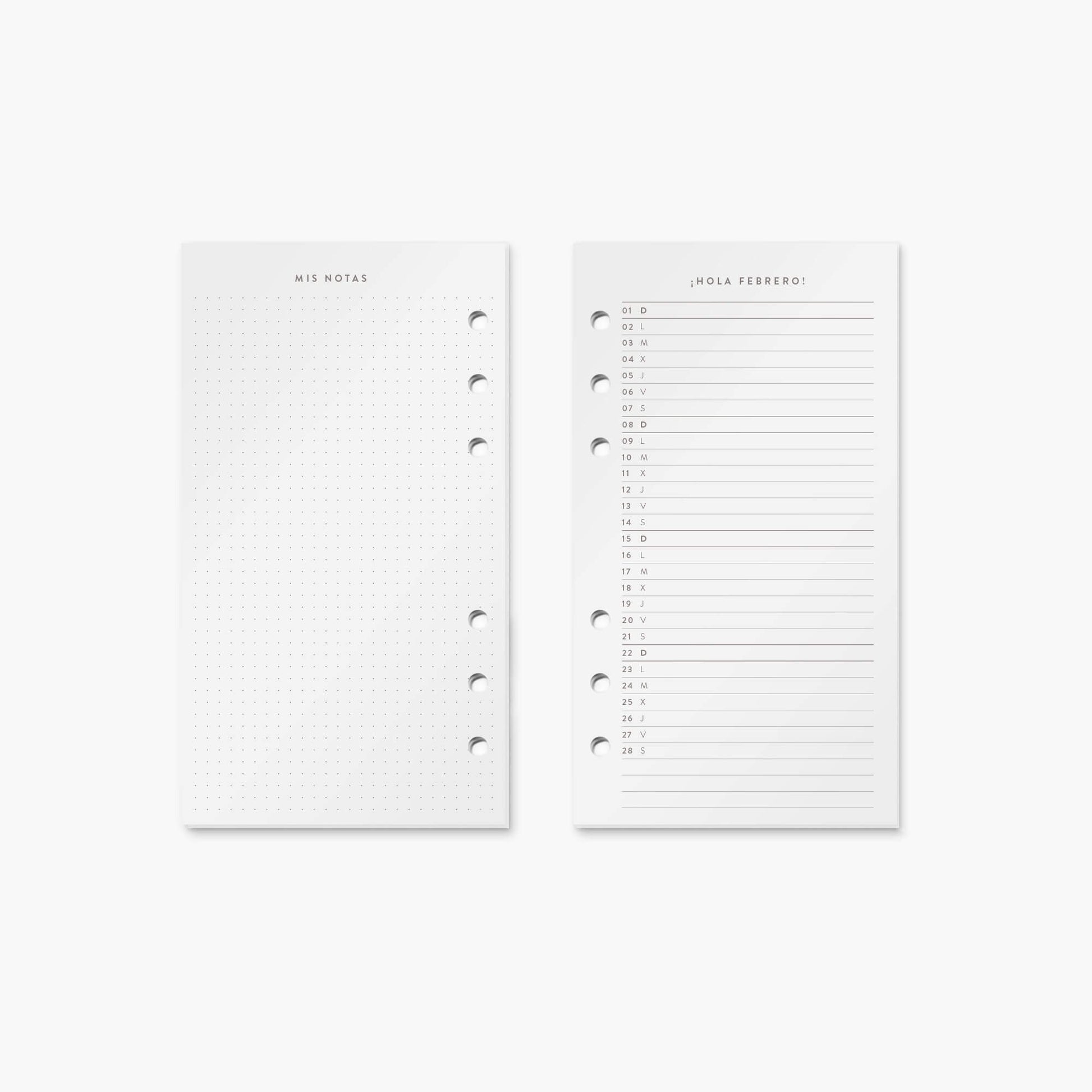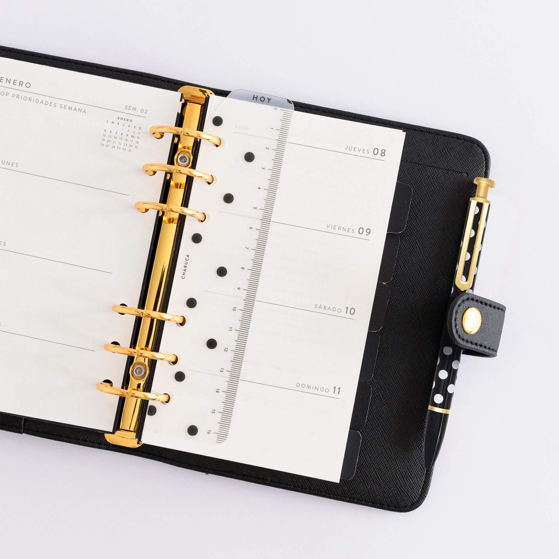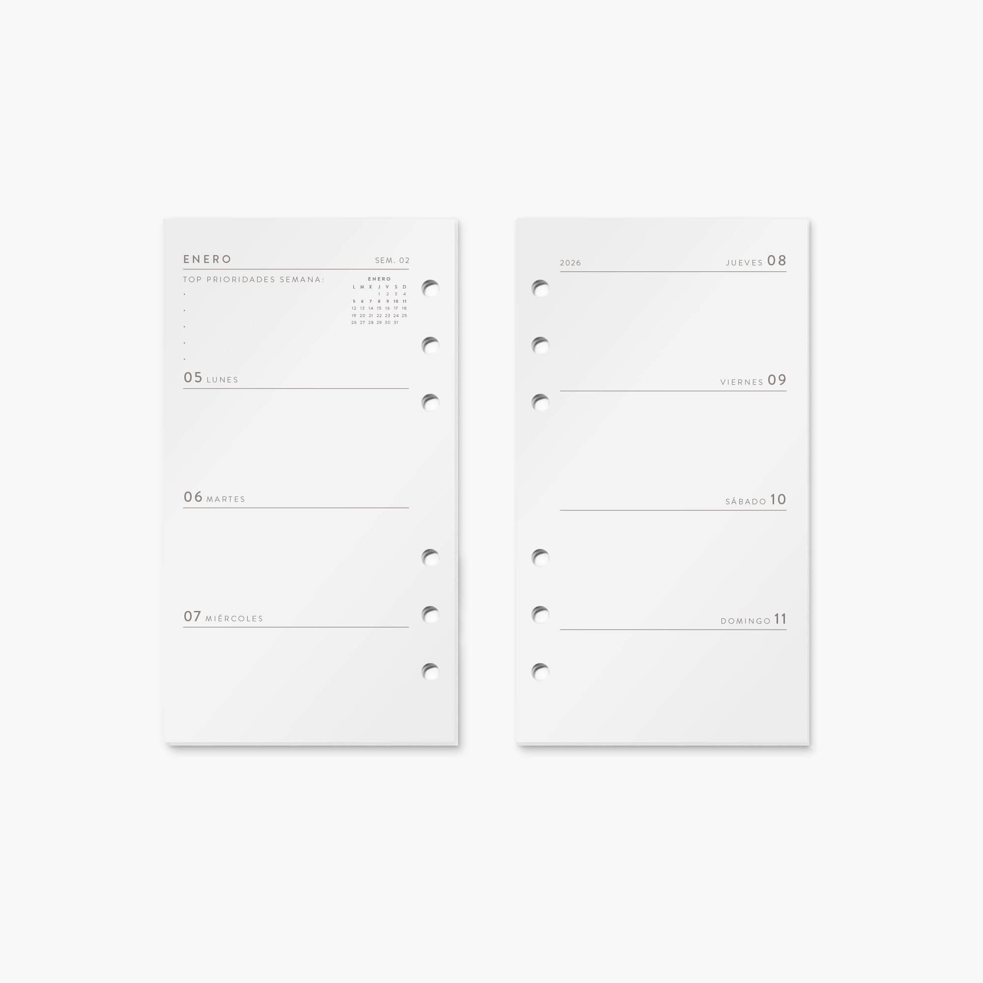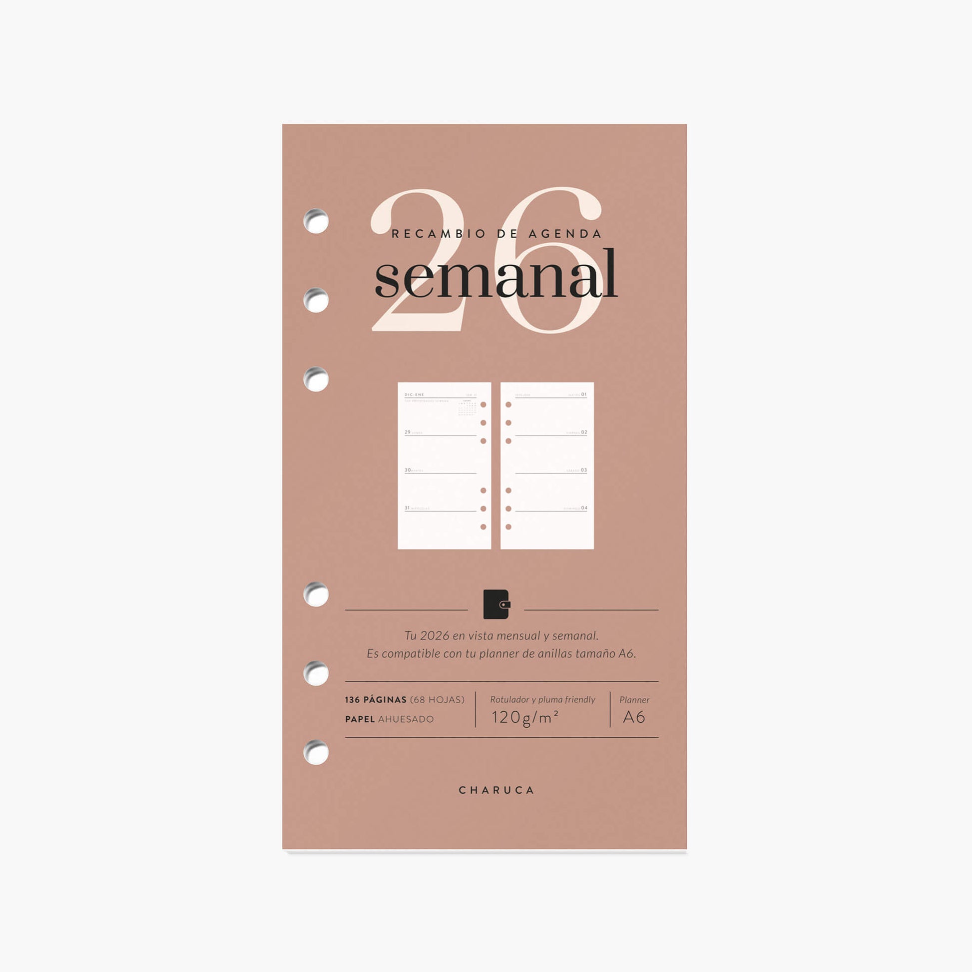Tu recambio de agenda 2026 en vista semanal. Este recambio es compatible con tu agenda de anillas (planner) tamaño A6. También contiene planificadores mensuales. Hecho en España con amor y sin prisas.