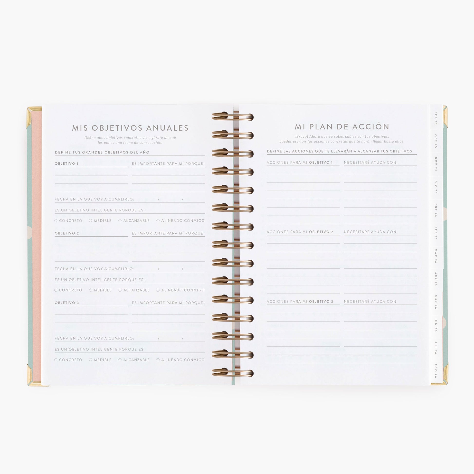 Esta agenda se va a convertir en tu mejor amiga y tu coach, porque te ayuda a organizarte, a mantenerte motivada y trabajar en tus objetivos con foco y constancia. Está hecha en España, con amor y sin prisas.