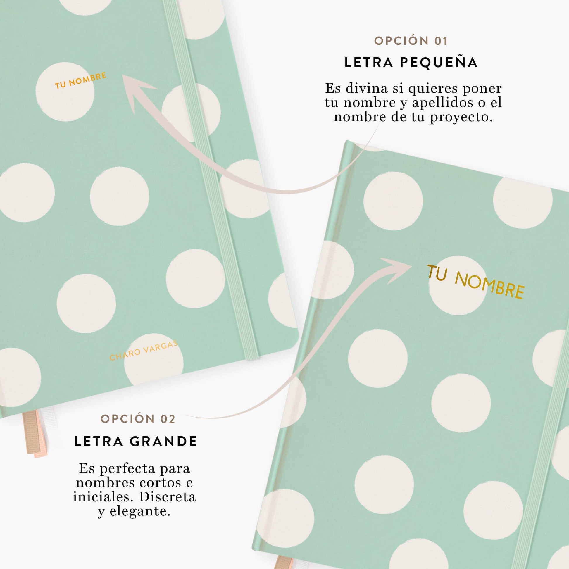 En Charuca tenemos un servicio de personalización artesanal. Escribe tu nombre o tus iniciales con letras doradas en la portada de tu papelería favorita. Puedes elegir entre dos tamaños de letra.