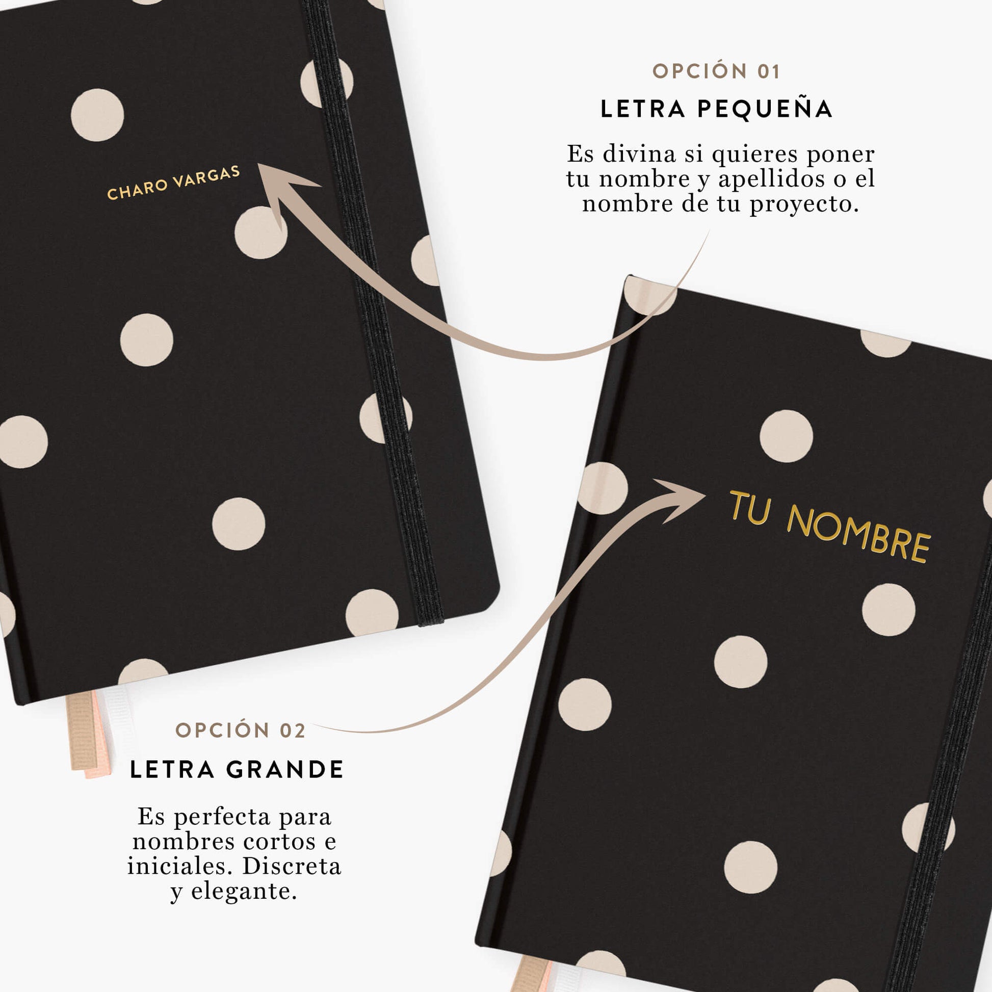 En Charuca tenemos un servicio de personalización artesanal. Escribe tu nombre o tus iniciales con letras doradas en la portada de tu papelería favorita. Puedes elegir entre dos tamaños de letra.