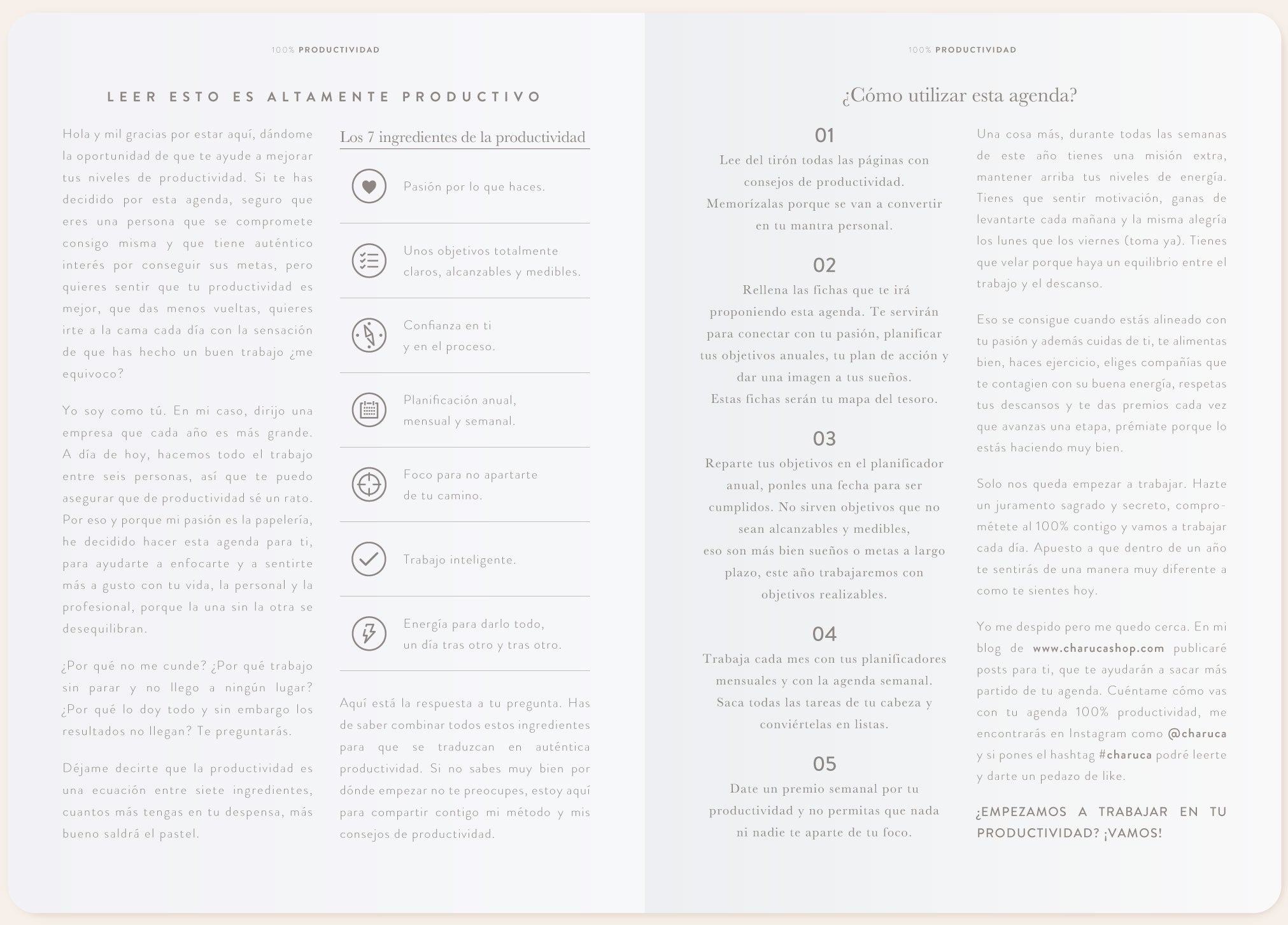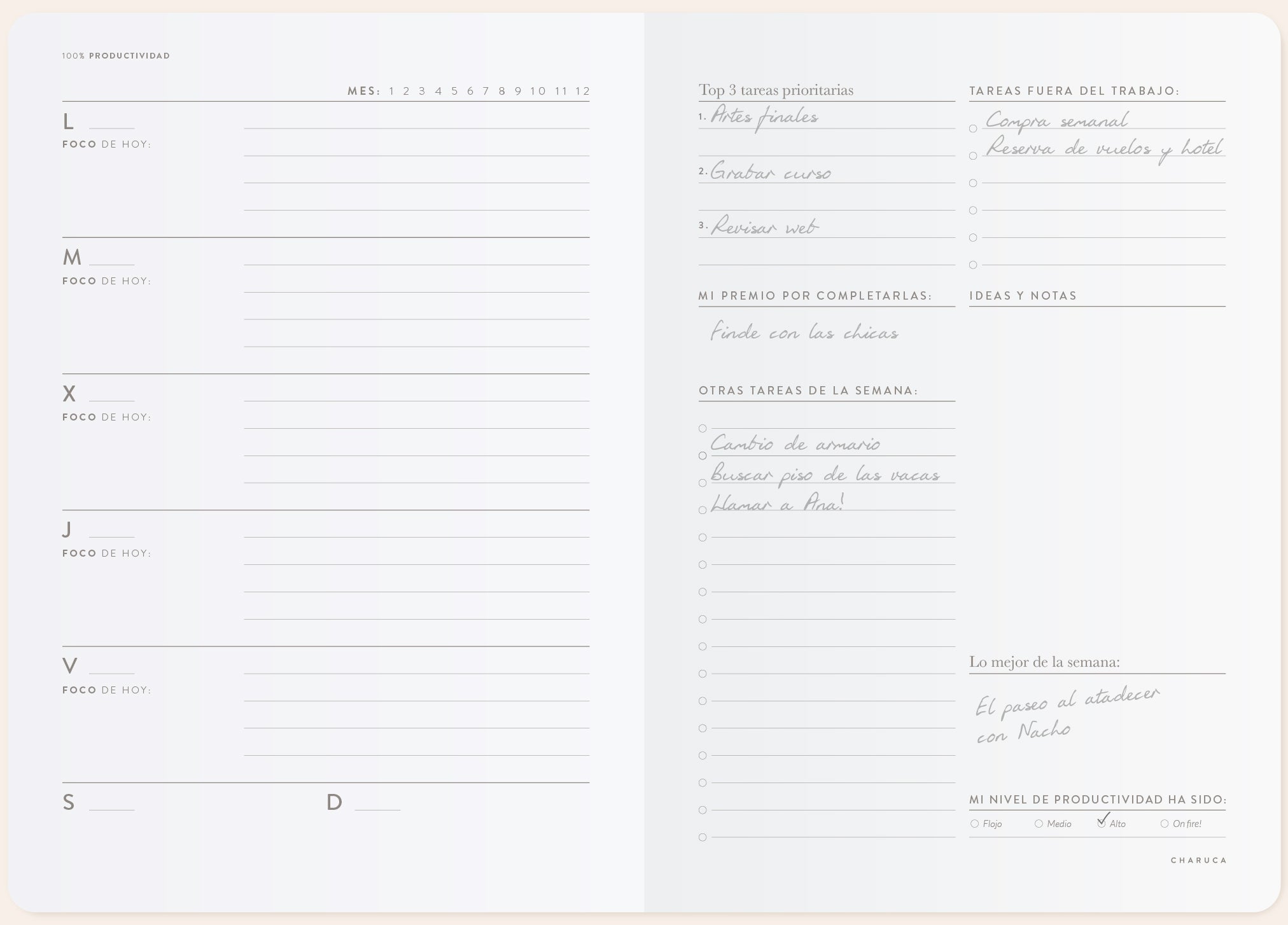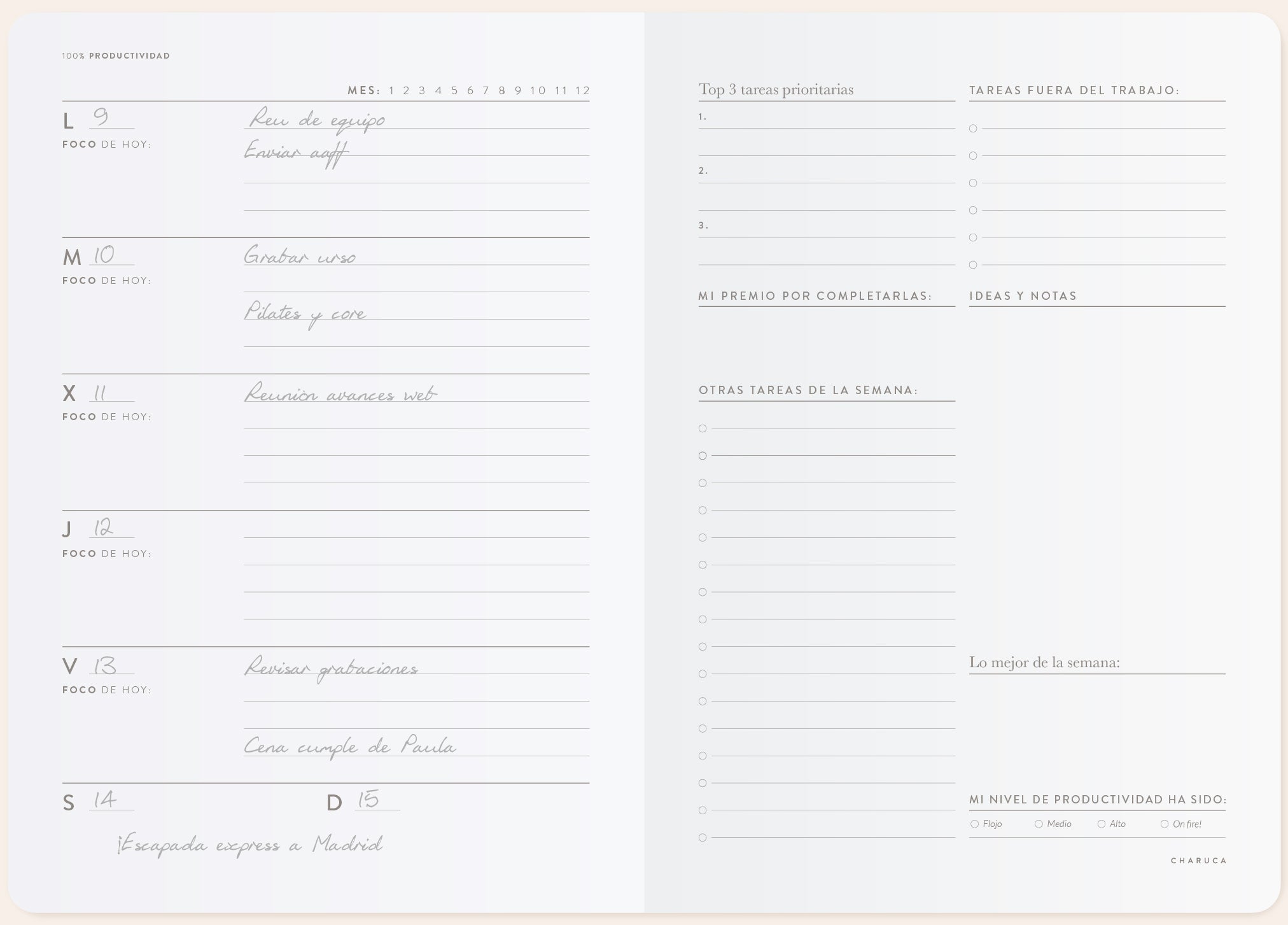 ¿Te sientes sobrepasada? ¿Acabas tus días agotada y con la sensación de que no avanzas? En Charuca te hemos preparado una solución para ti, tu agenda 100% Productividad, tu método de trabajo para que aprendas a planificarte y a priorizar lo importante para sentirte 100% satisfecha.