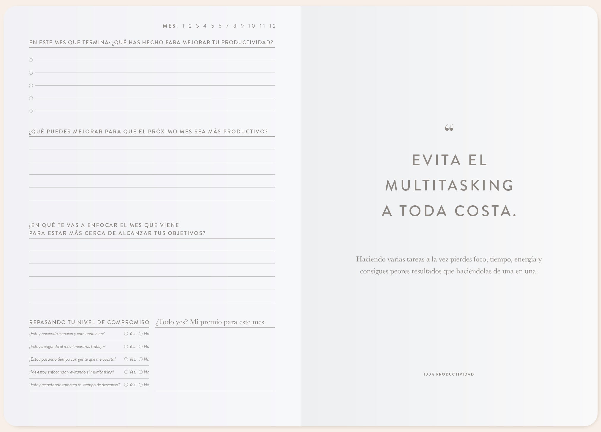 La agenda 100% Productividad tiene un sistema semanal de organización de tareas que te ayudará a identificar lo que es importante para ti y a enfocar toda tu energía en esa dirección.