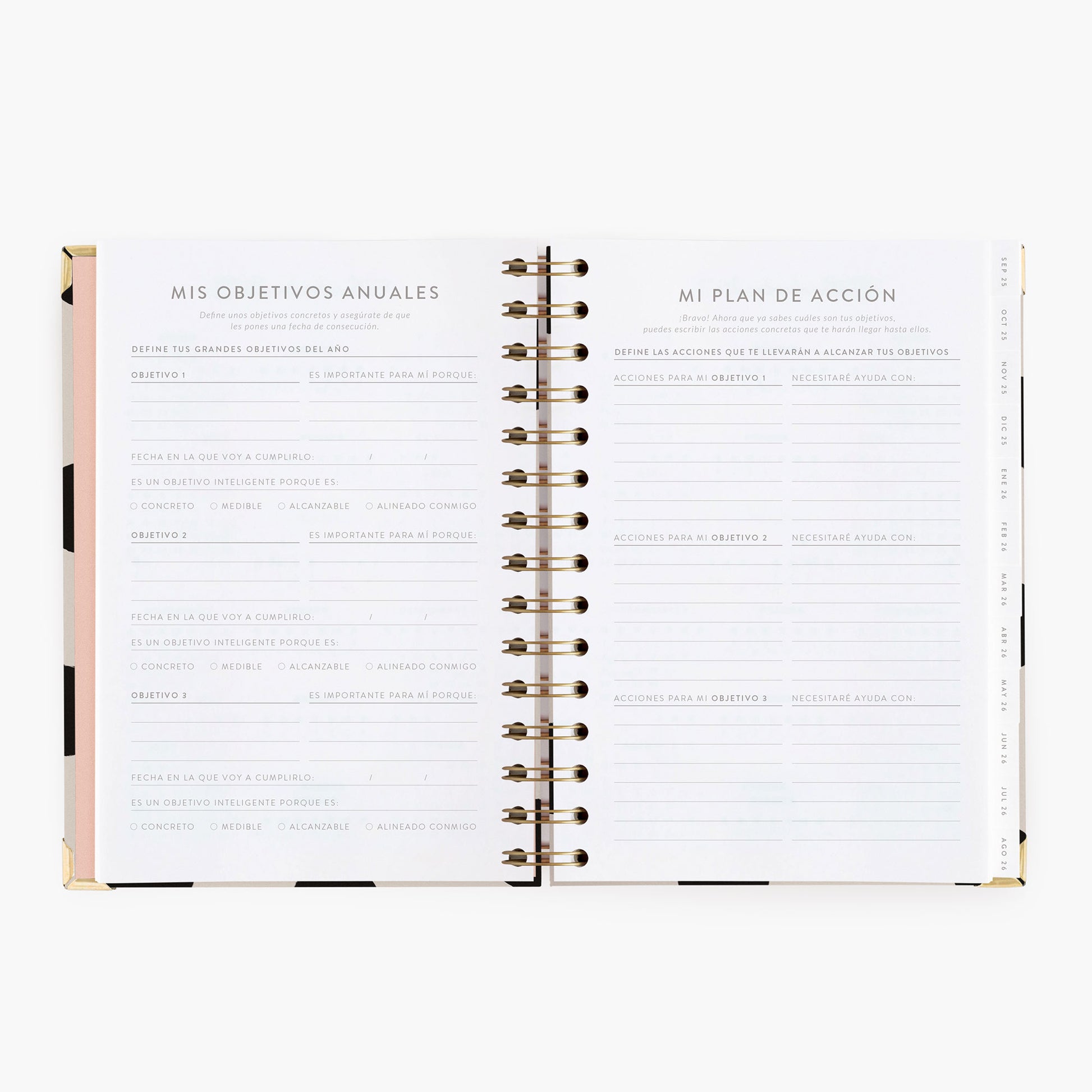 Esta agenda se va a convertir en tu mejor amiga y tu coach, porque te ayuda a organizarte, a mantenerte motivada y trabajar en tus objetivos con foco y constancia. Está hecha en España, con amor y sin prisas.