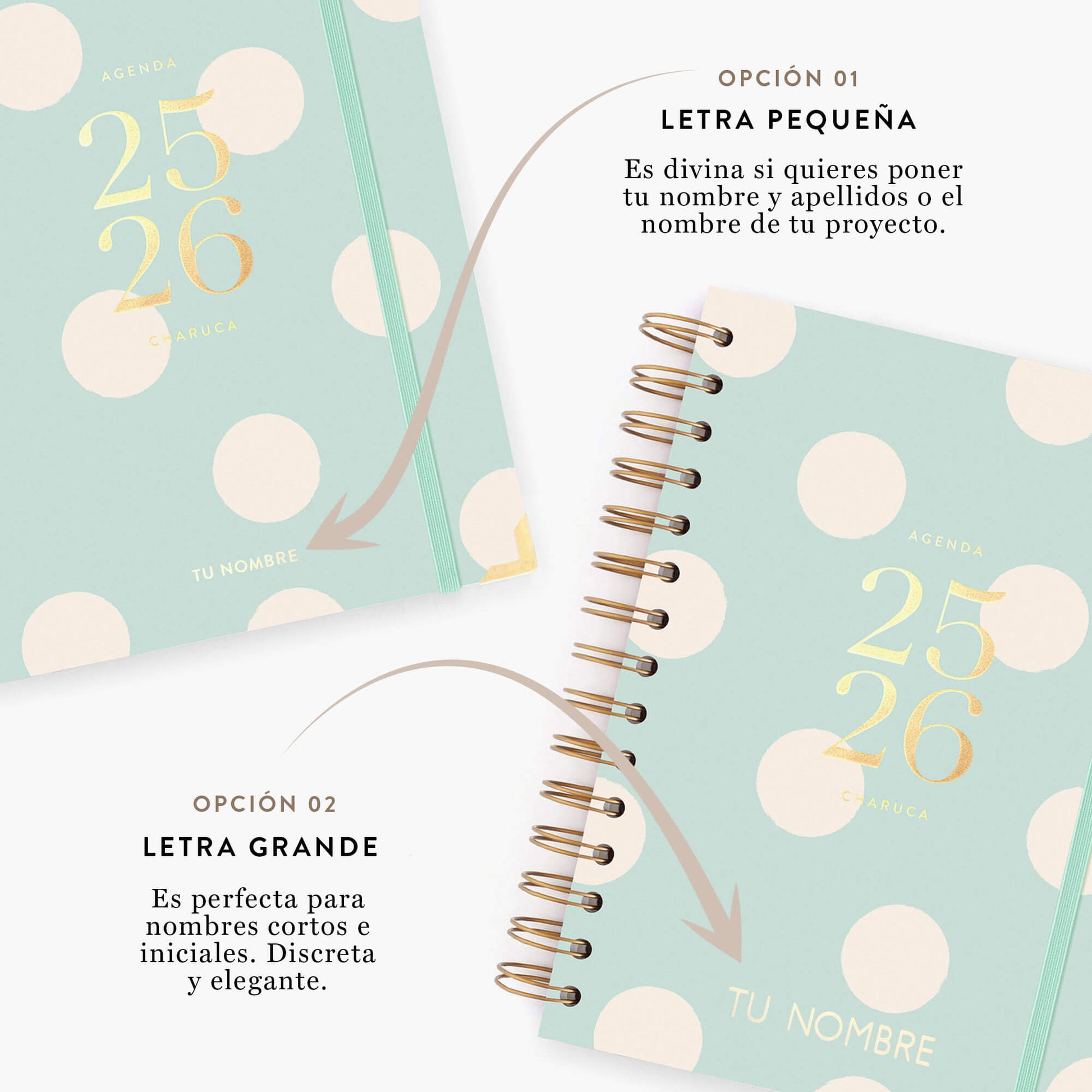 En Charuca tenemos un servicio de personalización artesanal. Escribe tu nombre o tus iniciales con letras doradas en la portada de tu papelería favorita. Puedes elegir entre dos tamaños de letra.