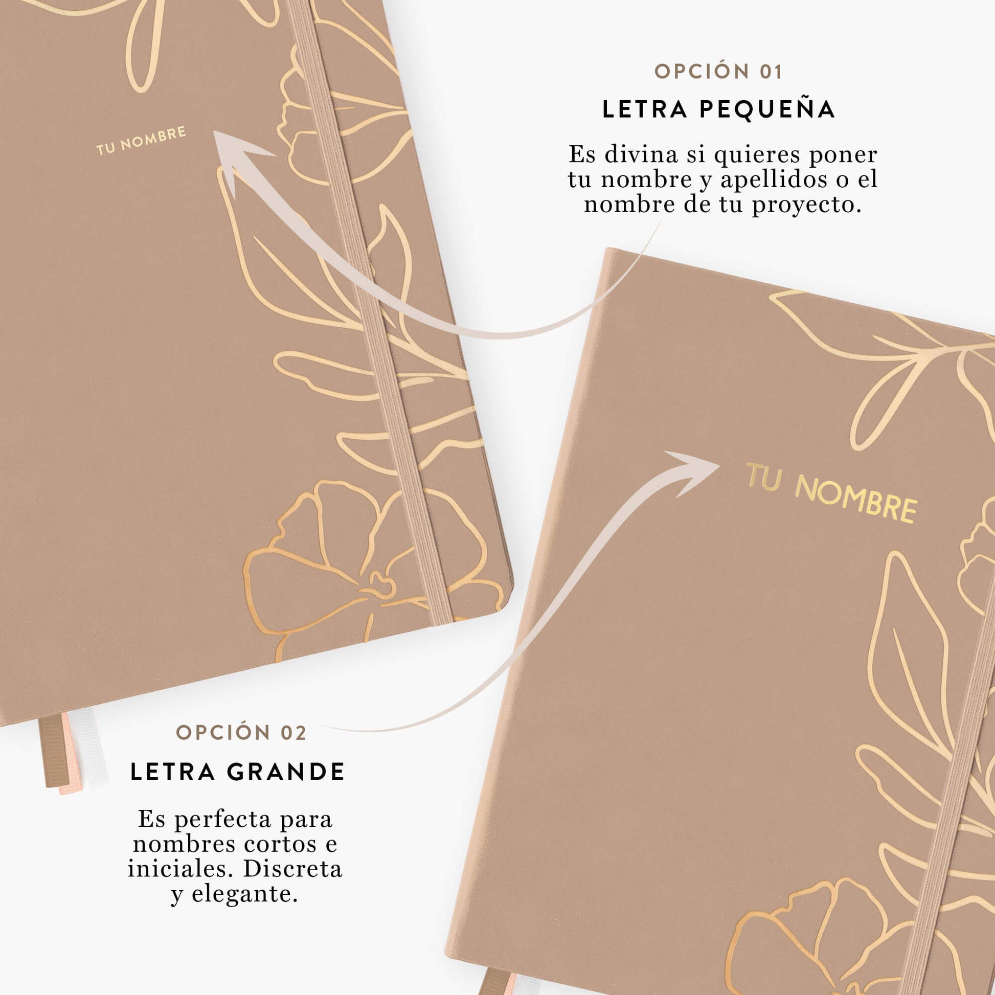 En Charuca tenemos un servicio de personalización artesanal. Escribe tu nombre o tus iniciales con letras doradas en la portada de tu papelería favorita. Puedes elegir entre dos tamaños de letra.