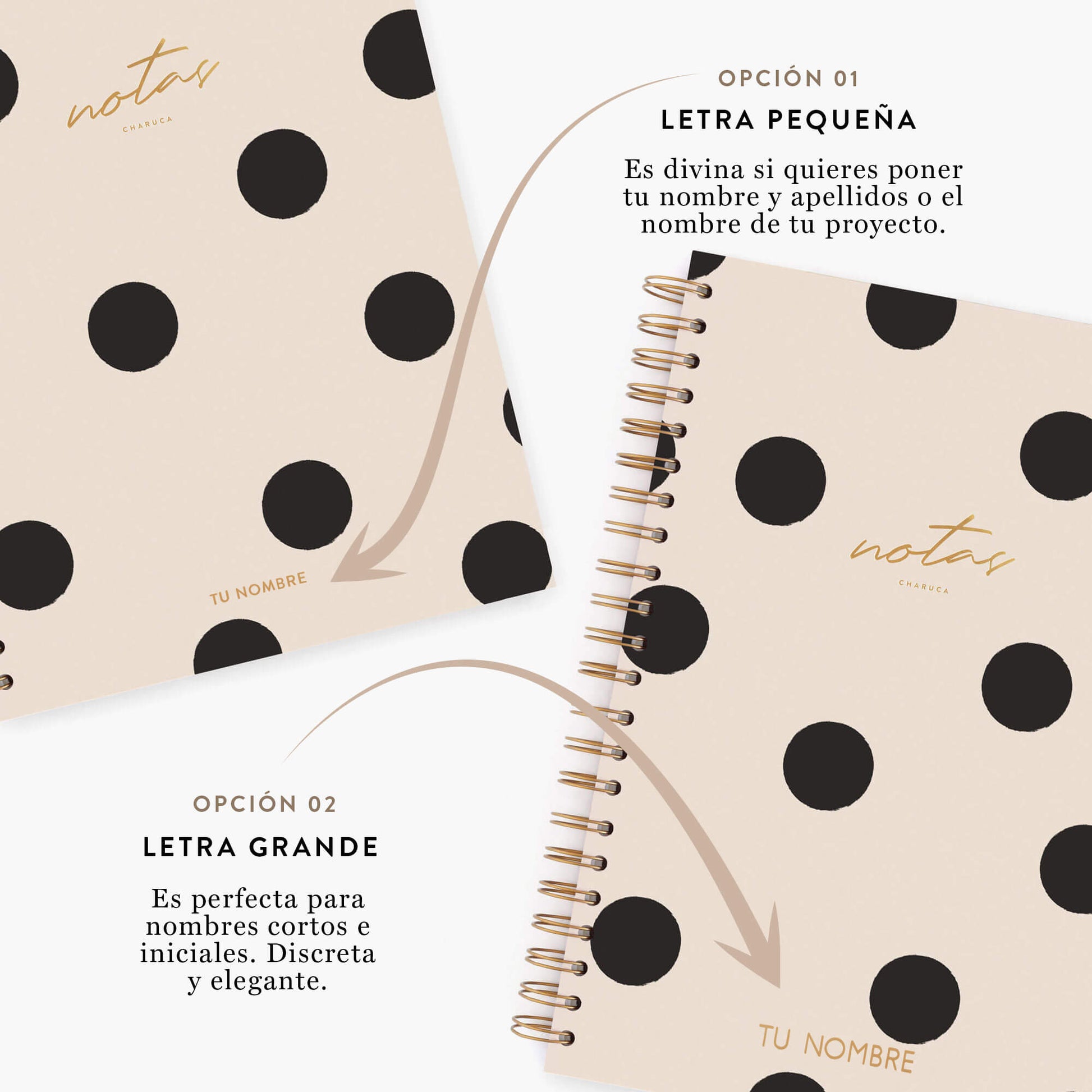 En Charuca tenemos un servicio de personalización artesanal. Escribe tu nombre o tus iniciales con letras doradas en la portada de tu papelería favorita. Puedes elegir entre dos tamaños de letra.